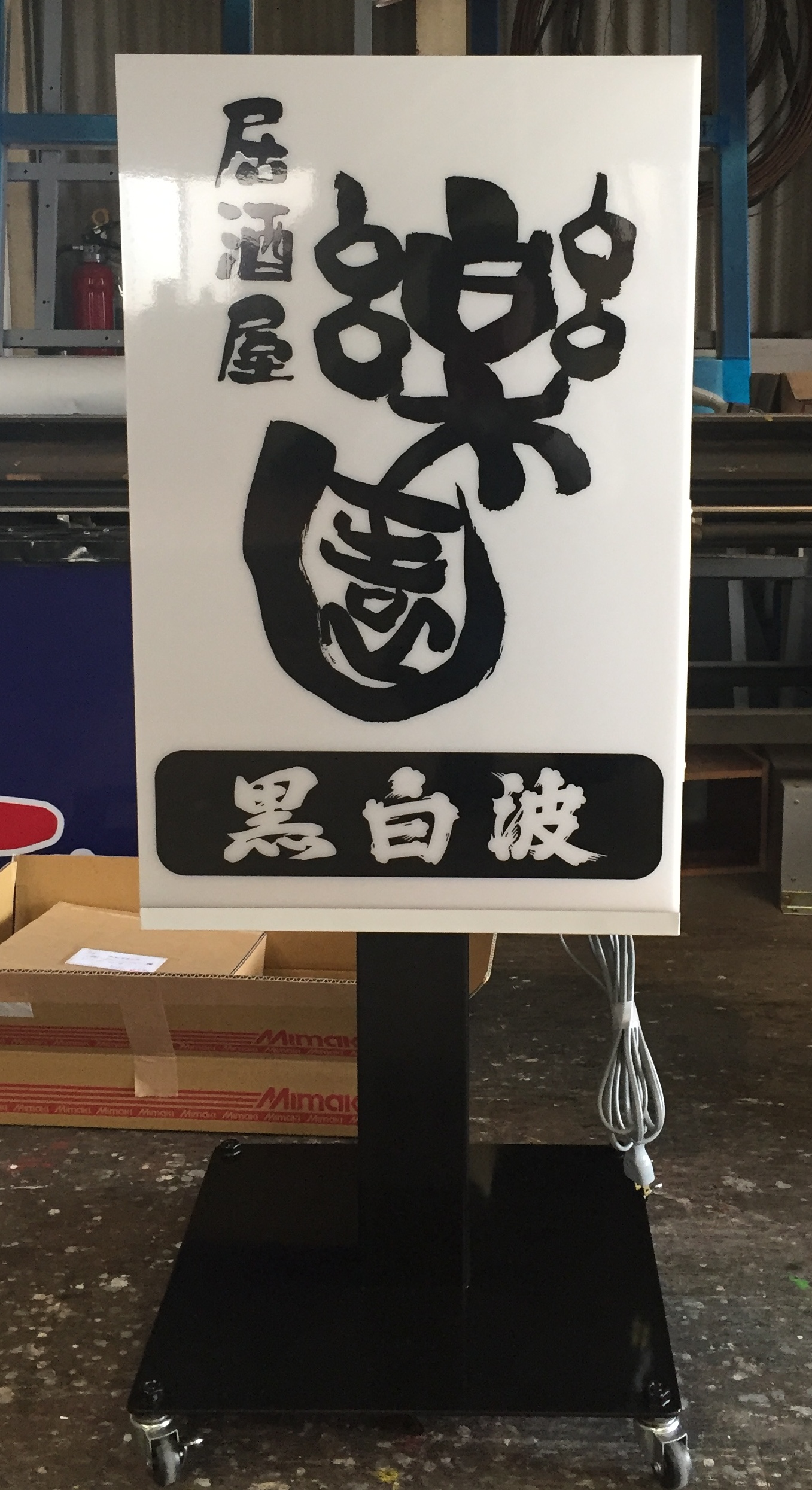 透明のメディアにインクジェット出力した物をアクリルのスタンド看板に貼っています。